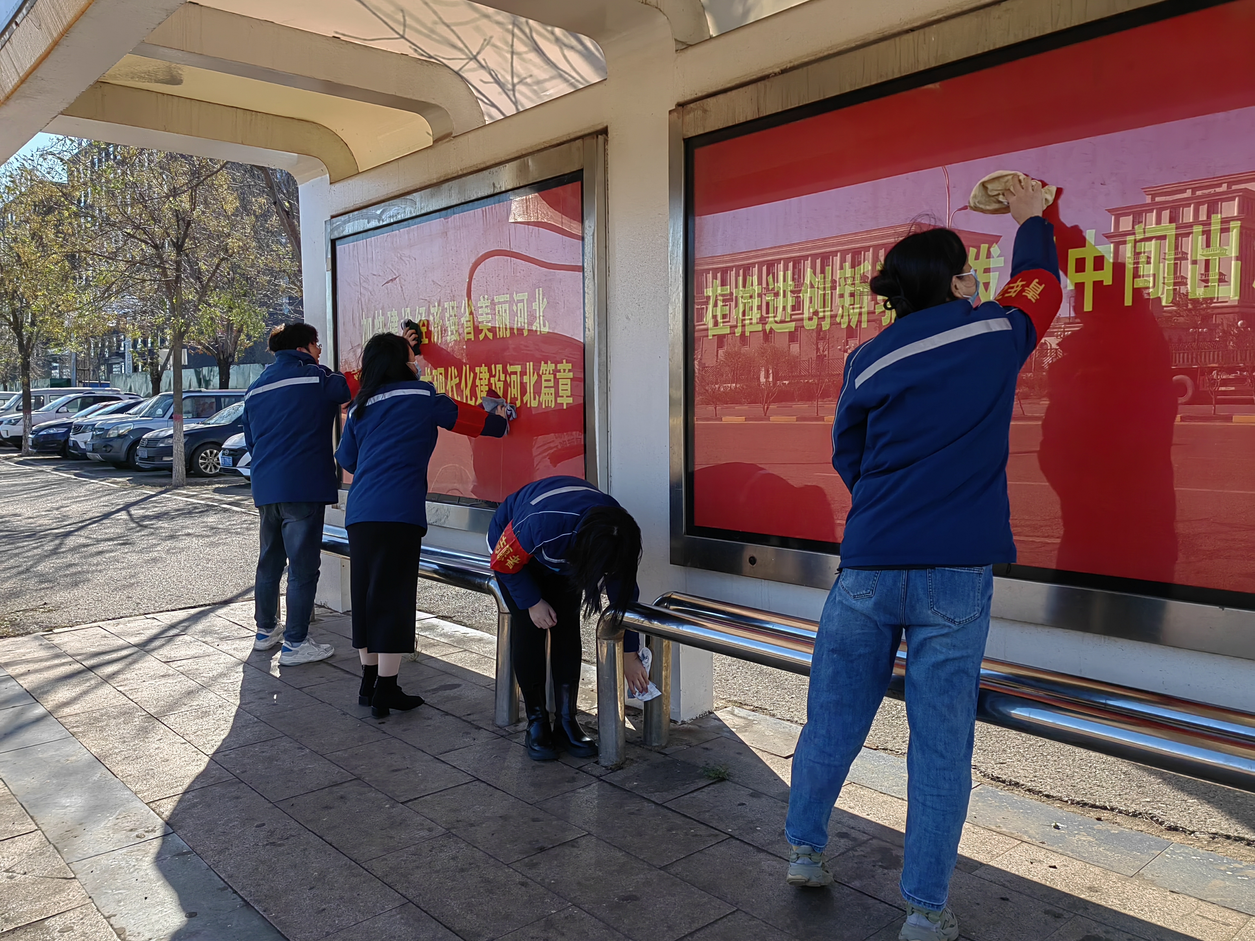 過程中,志愿者們用手中的清潔工具仔細(xì)的擦洗公交站臺(tái),有的認(rèn)真擦拭站臺(tái)的污垢,有的認(rèn)真去掉粘貼在站臺(tái)的膠痕,經(jīng)過志愿者們的一番清理,公交站候車亭面貌煥然一新。