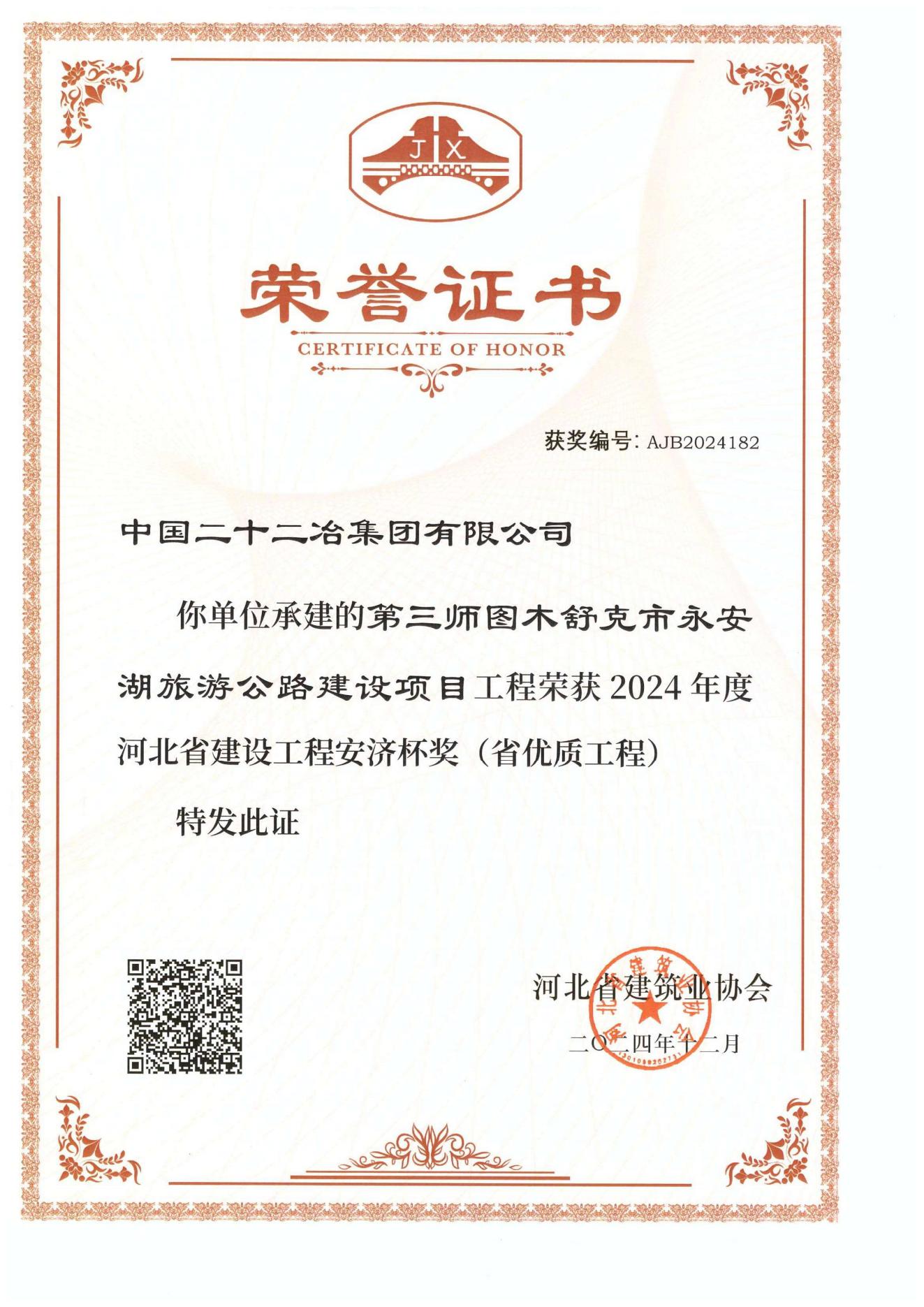 近日,河北省建筑業(yè)協(xié)會(huì)公布2024年度河北省建設(shè)工程安濟(jì)杯獎(jiǎng)(省優(yōu)質(zhì)工程)獲獎(jiǎng)工程名單,經(jīng)過(guò)專家初審、現(xiàn)場(chǎng)復(fù)查,評(píng)委會(huì)評(píng)審、網(wǎng)上公示和公告,由新疆公司承建的第三師圖木舒克市永安湖旅游公路建設(shè)項(xiàng)目榮獲河北省建設(shè)工程安濟(jì)杯獎(jiǎng)(省優(yōu)質(zhì)工程)。