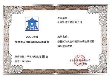 7月21日收到證書,北京崇建公司“崇禮區(qū)冬奧會(huì)特勤消防站建設(shè)項(xiàng)目BIM應(yīng)用成果”被評(píng)為2020年度北京市工程建設(shè)BIM單項(xiàng)應(yīng)用成果Ⅲ類。