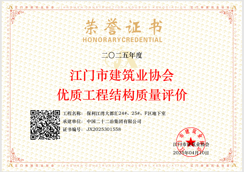 近日,廣東公司承建的江門保利江灣大都匯項目榮獲江門市建筑業(yè)協(xié)會優(yōu)質(zhì)工程結(jié)構(gòu)質(zhì)量評價。