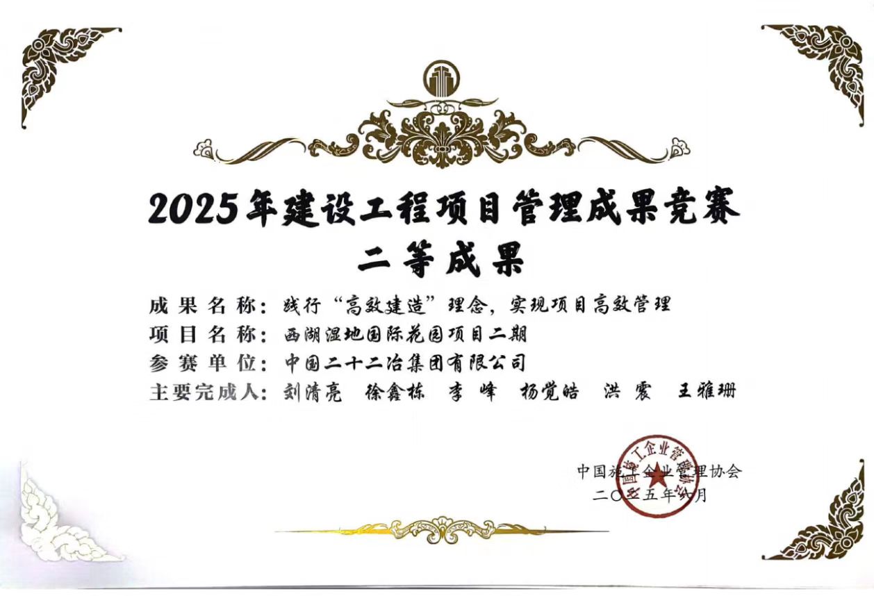 近日,在2025年中國施工企業(yè)管理協(xié)會舉辦的建設(shè)工程項(xiàng)目管理成果競賽中,廣東公司西湖濕地園際花園項(xiàng)目二期獲得二等成果,成果名稱“踐行‘高效建造’理念,實(shí)現(xiàn)項(xiàng)目高效管理”。