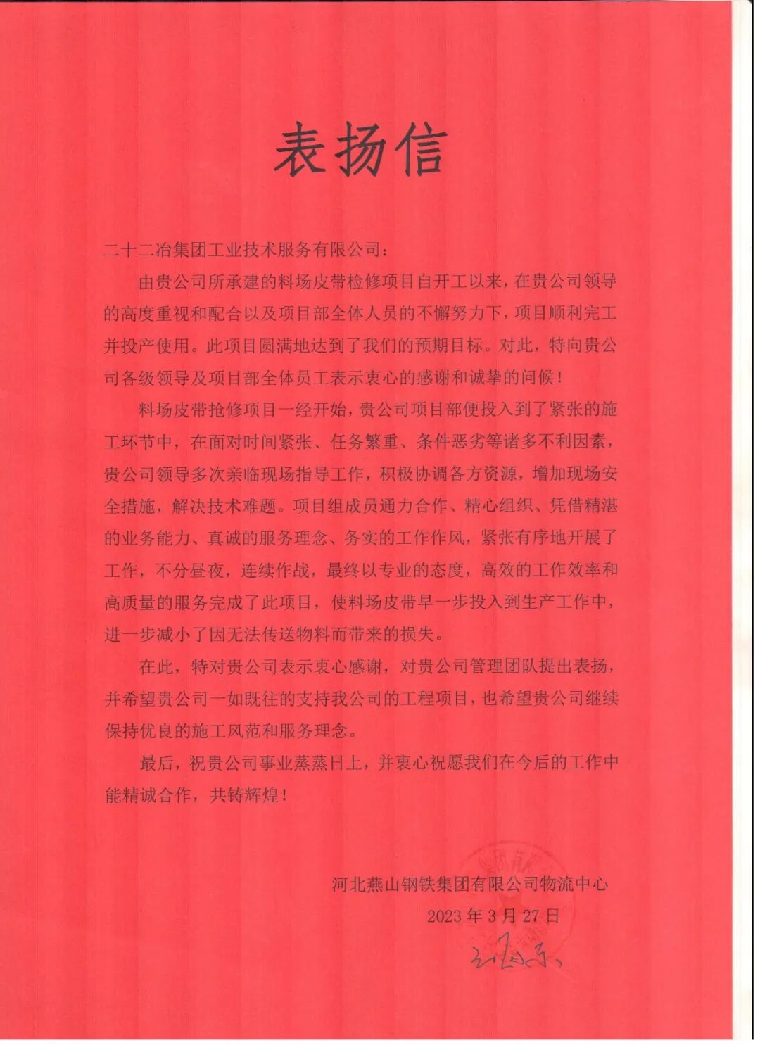 近日,工業(yè)技術(shù)公司燕鋼項目部在承建的河北燕鋼集團料場皮帶檢修項目、煉鋼二廠1#轉(zhuǎn)爐爐役及2#連鑄檢修施工中以專業(yè)的技術(shù),高效的工作效率和高質(zhì)量服務(wù)順利完成各項檢修任務(wù),得到了甲方業(yè)主的高度贊許,并收到來自業(yè)主的表揚信。