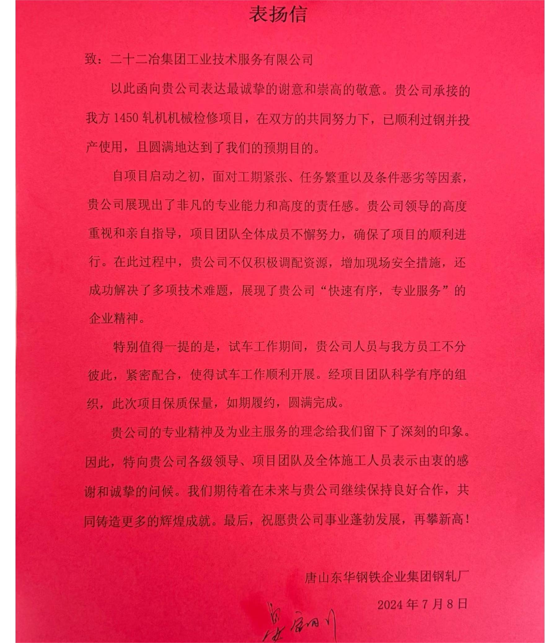 值得一提的是,在項目竣工之際,收到了來自業(yè)主東華鋼鐵的表揚信,字里行間滿載著對工業(yè)技術(shù)公司專業(yè)、高效、貼心的認可與贊譽。這不僅是對過往合作的最好肯定,更是對未來攜手共進的美好期許。