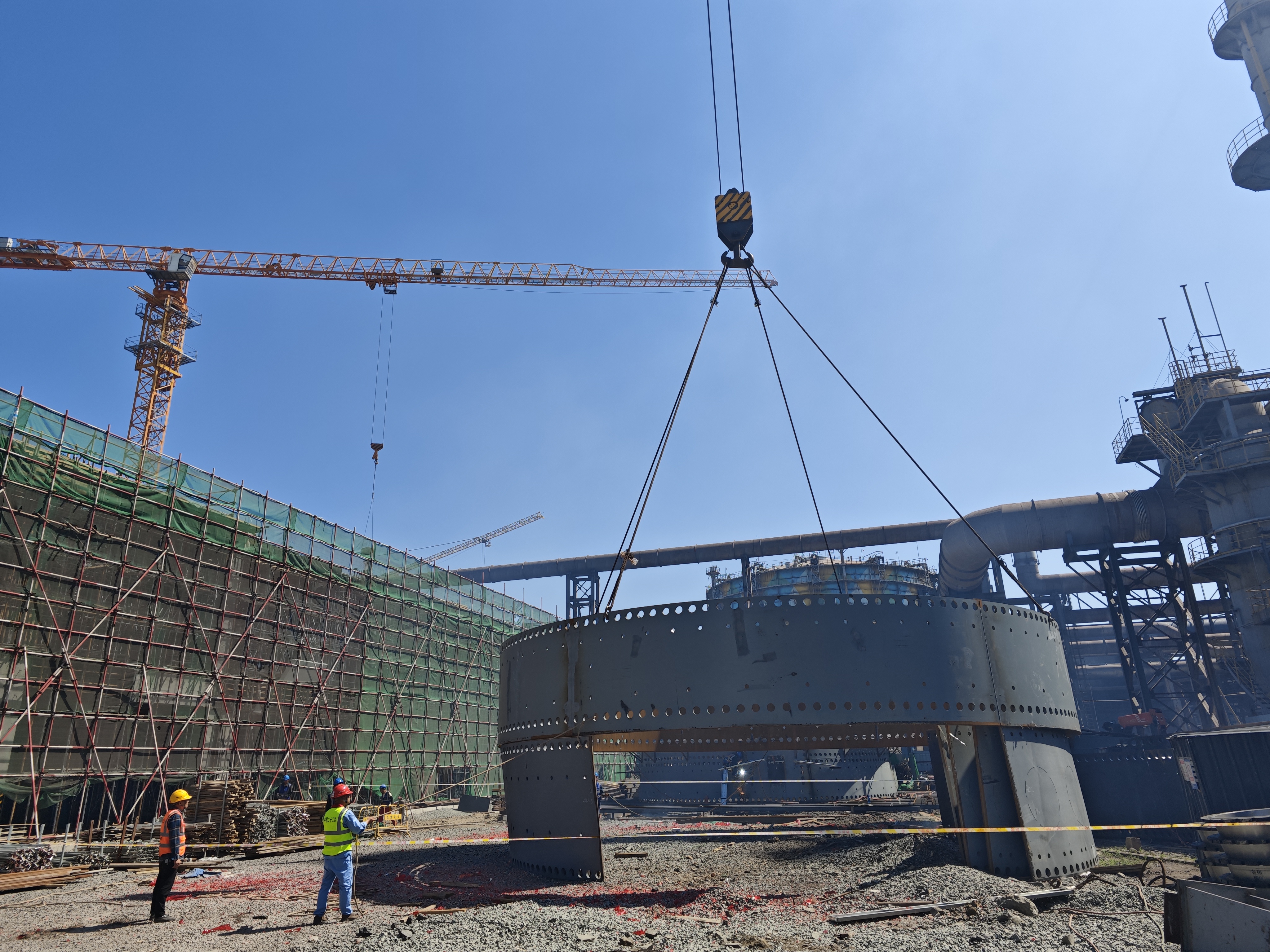 2#高爐第一代高爐直徑12.312米,爐殼由五塊組成,總重量28.86噸。為滿足業(yè)主節(jié)點及工期要求,項目團隊精心籌劃,全力推進鋼結(jié)構(gòu)爐殼、吊車、人員進場計劃,同時帶領(lǐng)安裝隊加班加點搶工期,保質(zhì)保量完成施工任務(wù),保證爐殼順利安裝完成,為后續(xù)的施工做好完美鋪墊。