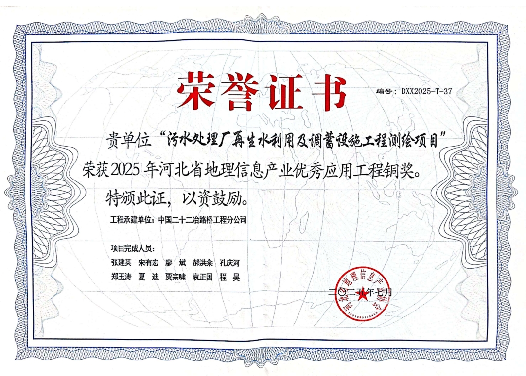 近日獲悉,在河北省地理信息產(chǎn)業(yè)協(xié)會主辦的權(quán)威評選中,路橋公司憑借“污水處理廠再生水利用及調(diào)蓄設(shè)施工程測繪項目”的卓越實踐,榮獲“2025年河北省地理信息產(chǎn)業(yè)優(yōu)秀應(yīng)用工程銅獎”。
