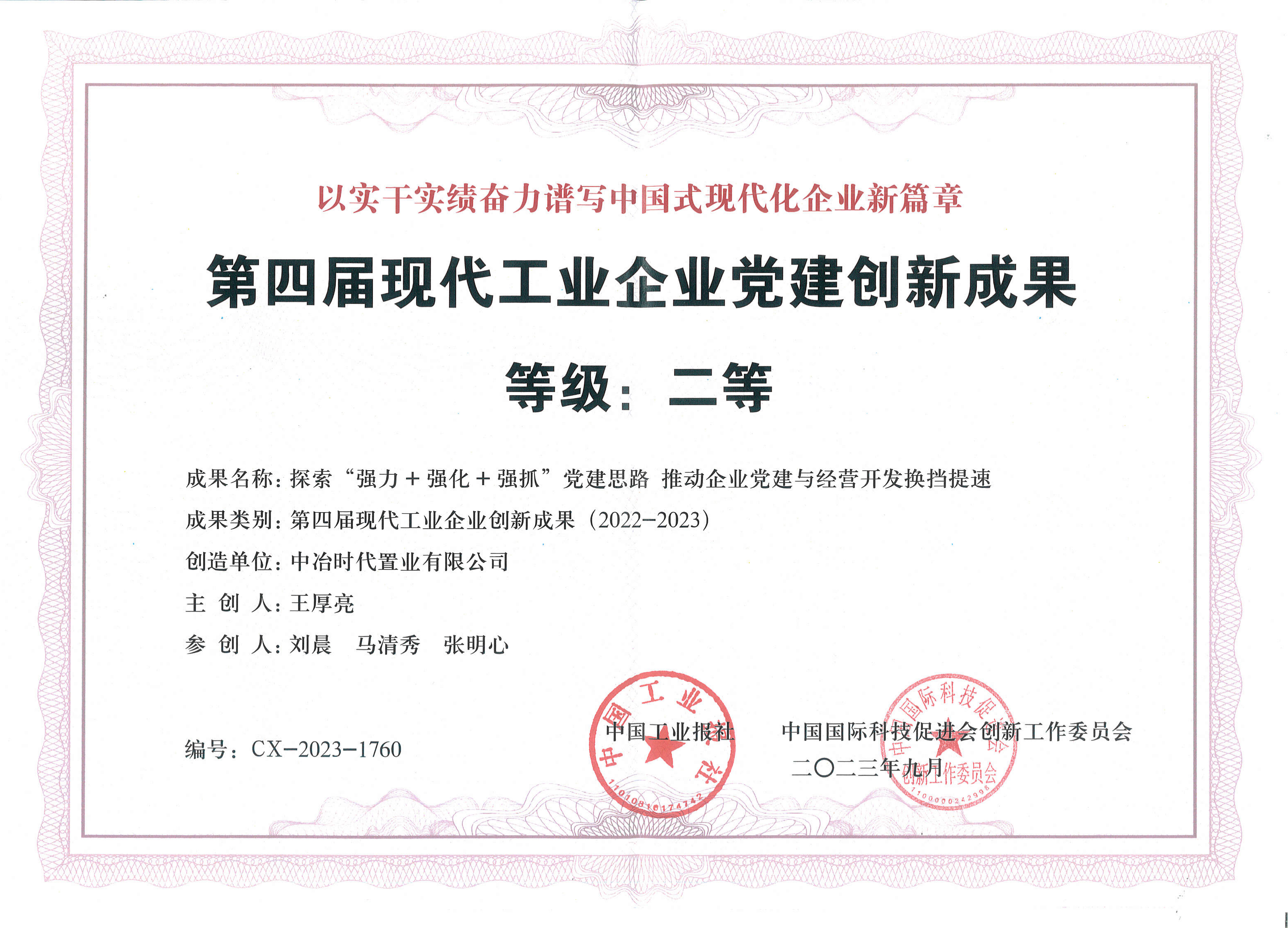 10月21日,在2023中國(guó)工業(yè)企業(yè)創(chuàng)新大會(huì)暨第四屆現(xiàn)代工業(yè)創(chuàng)新成果發(fā)布儀式上,時(shí)代置業(yè)公司申報(bào)的《探索“強(qiáng)力+強(qiáng)化+強(qiáng)抓”黨建思路 推動(dòng)企業(yè)黨建與經(jīng)營(yíng)開(kāi)發(fā)換擋提速》獲黨建創(chuàng)新成果二等獎(jiǎng),并被收錄至全國(guó)創(chuàng)新案例。