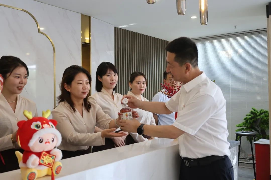 在浭陽新城售樓處,張學鋒向置業(yè)顧問表達了親切的問候,對她們忠于職守、勤勤懇懇的敬業(yè)精神表示充分肯定,并將清涼飲料送到她們手中,叮囑她們在堅守崗位的同時要注意防暑和安全,以更好的狀態(tài)投入到銷售工作中。