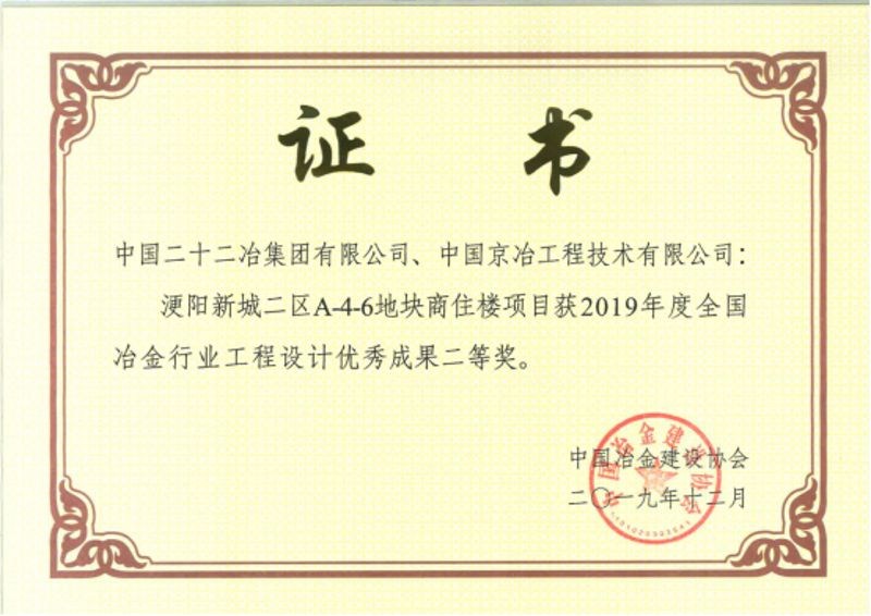 中國二十二冶集團(tuán)有限公司設(shè)計(jì)院設(shè)計(jì)的唐山市豐潤區(qū)浭陽二區(qū)A-4-6地塊商住樓項(xiàng)目喜獲兩項(xiàng)大獎(jiǎng):中國冶金協(xié)會(huì)優(yōu)秀設(shè)計(jì)成果二等獎(jiǎng)和中國鋼結(jié)構(gòu)協(xié)會(huì)科學(xué)技術(shù)獎(jiǎng)一等獎(jiǎng)。