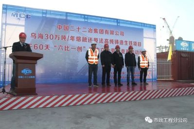 5月1日,市政公司2020年大干60天“六比一創(chuàng)”建功立業(yè)勞動競賽啟動儀式在烏海30萬噸/年熔融還原法高純鑄造生鐵項(xiàng)目部拉開帷幕。賽思普科技有限公司副總經(jīng)理周海川同志,二十二冶集團(tuán)公司工會綜合管理部業(yè)務(wù)主管常洪文同志,市政公司黨委副書記、紀(jì)委書記、代理工會主席季濤同志,市政公司總會計(jì)師盧衛(wèi)兵同志以及烏海項(xiàng)目相關(guān)人員出席此次活動。