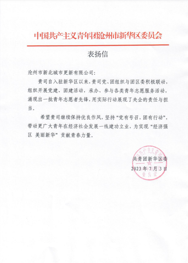 近日,滄州項(xiàng)目公司收到來自共青團(tuán)滄州市新華區(qū)委的表揚(yáng)信,信中對滄州項(xiàng)目公司積極承辦、參與各類青年志愿服務(wù)活動(dòng)表示肯定,用實(shí)際行動(dòng)展現(xiàn)了社會(huì)責(zé)任與擔(dān)當(dāng)。