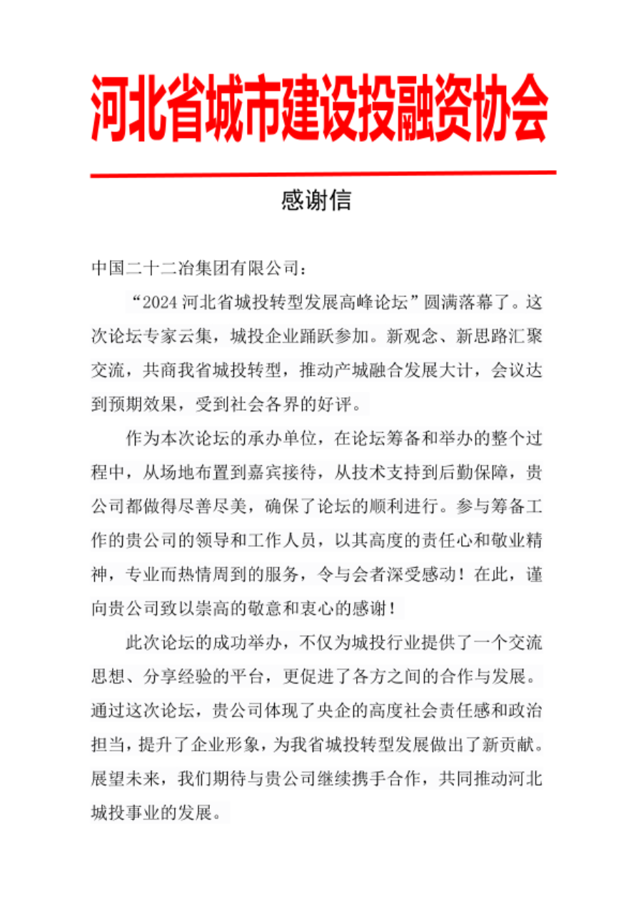 6月4日,投融資事業(yè)部收到河北省城市建設投融資協(xié)會感謝信,對事業(yè)部承辦“2024河北省城投轉(zhuǎn)型發(fā)展高峰論壇”活動并取得圓滿成功表示感謝。本次論壇以 “應對新變化 破解新難題 增添新動能 再謀新發(fā)展”為主題,旨在促進河北省城投公司實現(xiàn)市場化、產(chǎn)業(yè)化的轉(zhuǎn)型,70余家河北省城投公司、50余家咨詢單位及金融機構(gòu)代表;協(xié)會相關領導、行業(yè)內(nèi)專家;中國二十二冶集團相關領導共計200余人參加會議。受到了中國房地產(chǎn)報、河北電視臺、河北工人報、唐山電視臺、唐山勞動日報、長城網(wǎng)等各大媒體報道。