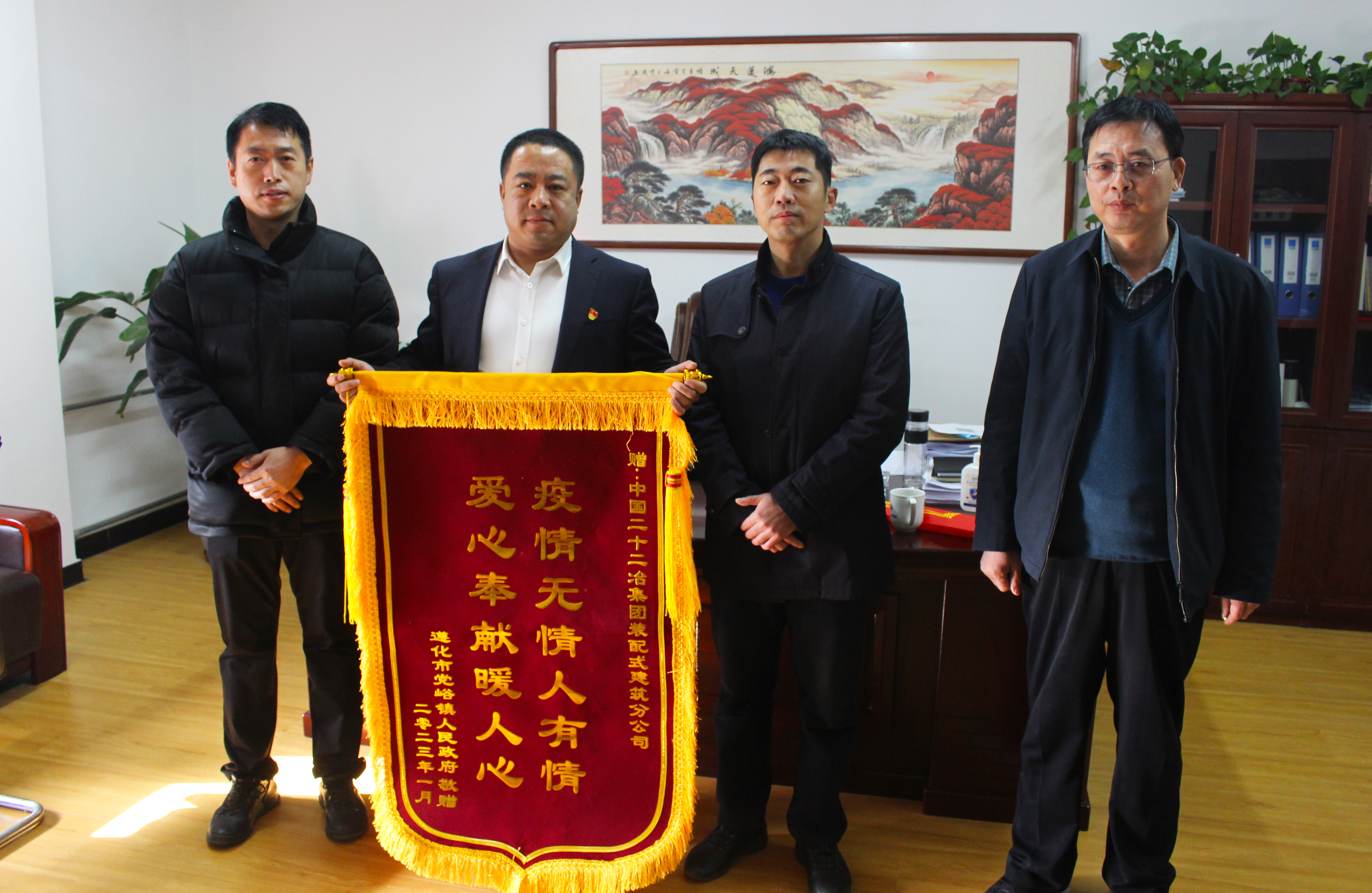1月18日,遵化市黨峪鎮(zhèn)人民政府代表將一面繡有“愛心奉獻暖人心 疫情無情人有情”的錦旗送至裝配式公司。對公司在疫情期間與駐地政府同舟共濟、共克時艱,積極履行央企社會責任,為疫情防控作出重大貢獻表示了衷心感謝。