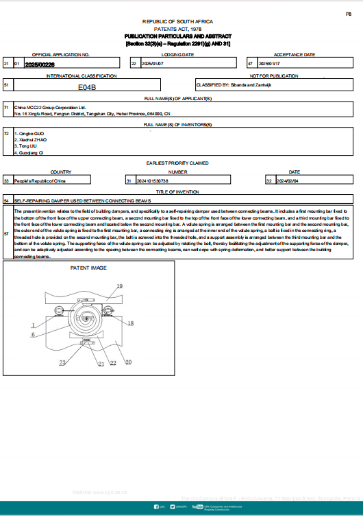 中國二十二冶裝配式分公司為開拓海外市場同時(shí)響應(yīng)“雙百”要求,結(jié)合公司海外發(fā)展戰(zhàn)略,積極開展國際專利申報(bào)工作。近日,申報(bào)的“應(yīng)用于連梁間的自修復(fù)型阻尼器”等1項(xiàng)專利獲批國際專利,標(biāo)志著公司科研創(chuàng)新實(shí)力與國際影響力的持續(xù)提升,為海外市場開展提供有力的技術(shù)支持。
