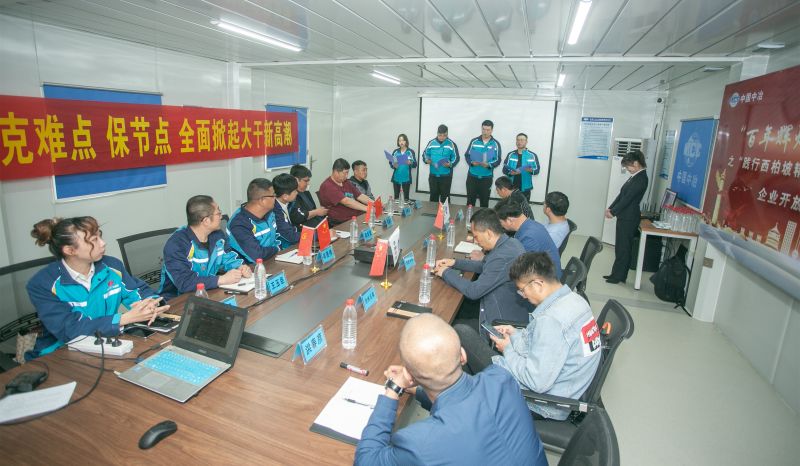 在“學(xué)黨史”環(huán)節(jié),通過“身臨其境學(xué)黨課”的方式講述了“選址西柏坡,新中國從這里走來”,緬懷革命先輩,不忘革命初心;項(xiàng)目青年團(tuán)朗誦詩歌《西柏坡精神頌》,展現(xiàn)項(xiàng)目青年員工積極向上、向黨靠攏的精神風(fēng)貌。在“悟思想”環(huán)節(jié),項(xiàng)目管理人員上臺(tái)宣誓,承諾在工作、生活中積極踐行“西柏坡精神”,建設(shè)人民滿意工程,造福滄州百姓;業(yè)主及項(xiàng)目管理人員在“抓重點(diǎn)、克難點(diǎn)、保節(jié)點(diǎn),全面掀起大干新高潮”條幅上簽字承諾。在“辦實(shí)事”環(huán)節(jié),項(xiàng)目經(jīng)理向青年突擊隊(duì)授旗,提高項(xiàng)目青年員工責(zé)任擔(dān)當(dāng)意識(shí),為項(xiàng)目各項(xiàng)工作開展提供強(qiáng)勁動(dòng)力;項(xiàng)目黨員干部、青年突擊隊(duì)隊(duì)員與協(xié)力隊(duì)伍人員及當(dāng)?shù)鼐用窠Y(jié)對(duì)幫扶,并發(fā)放志愿服務(wù)卡,全力以赴幫助他們解決生活、工作中遇到的問題。在“開新局”環(huán)節(jié),項(xiàng)目工程經(jīng)理帶領(lǐng)與會(huì)人員參觀施工現(xiàn)場,介紹項(xiàng)目的工程概況、工程重難點(diǎn),以及建設(shè)過程中的感人故事,讓與會(huì)人員感受企業(yè)的綜合實(shí)力以及建設(shè)人民滿意工程的決心和信心。