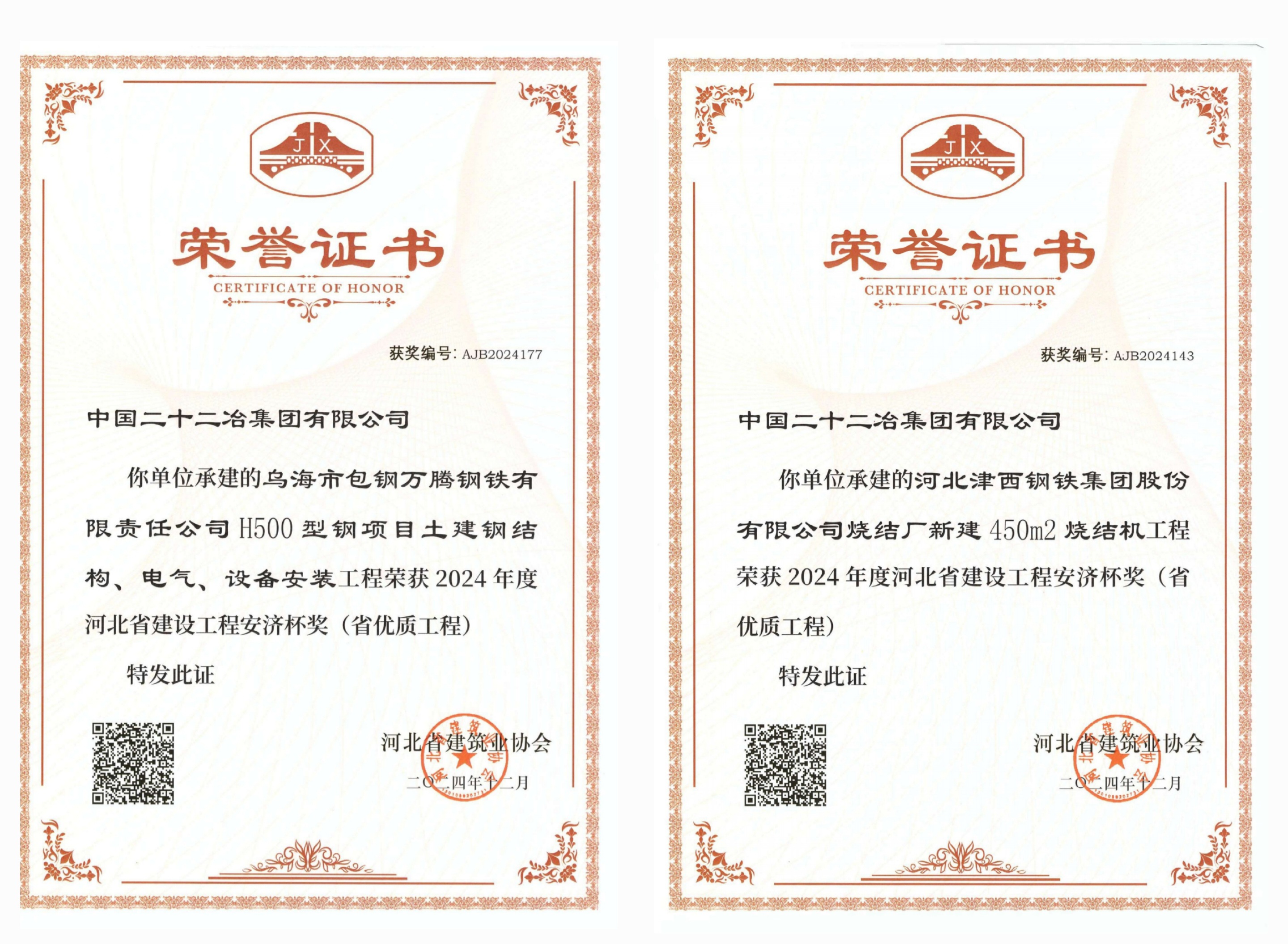 近日,六公司烏海市包鋼萬騰鋼鐵有限責任公司H500型鋼項目土建鋼結構、電氣、設備安裝工程和河北津西鋼鐵集團股份有限公司燒結廠新建450平方米燒結機工程榮獲2024年度河北省建設工程安濟杯獎(省優(yōu)質工程)獎。