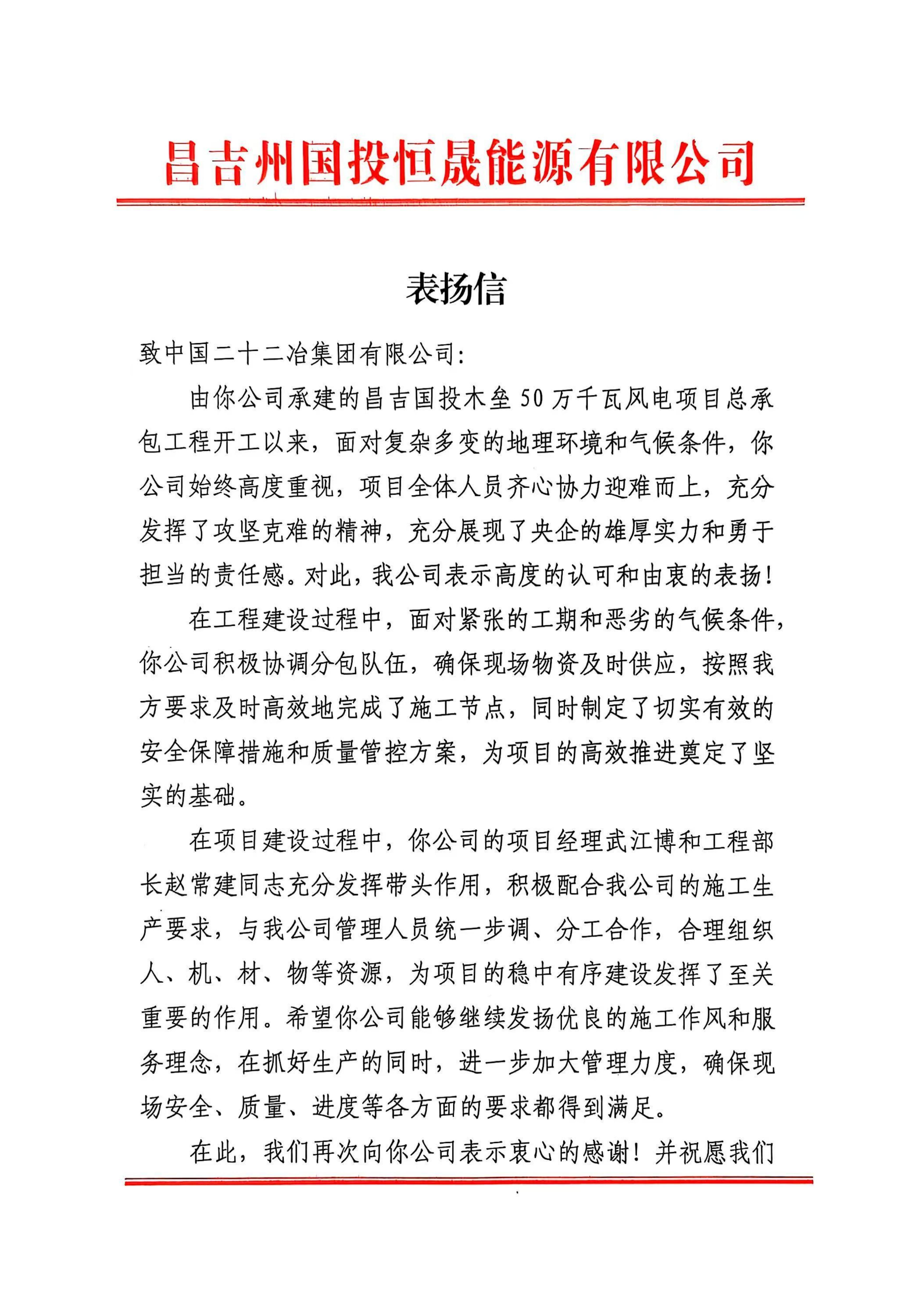 近日,昌吉州國投恒晟能源有限公司發(fā)給中國二十二冶集團有限公司的表揚信,對新疆公司在昌吉國投木壘50萬千瓦風電項目建設中高質量履約提出表揚。