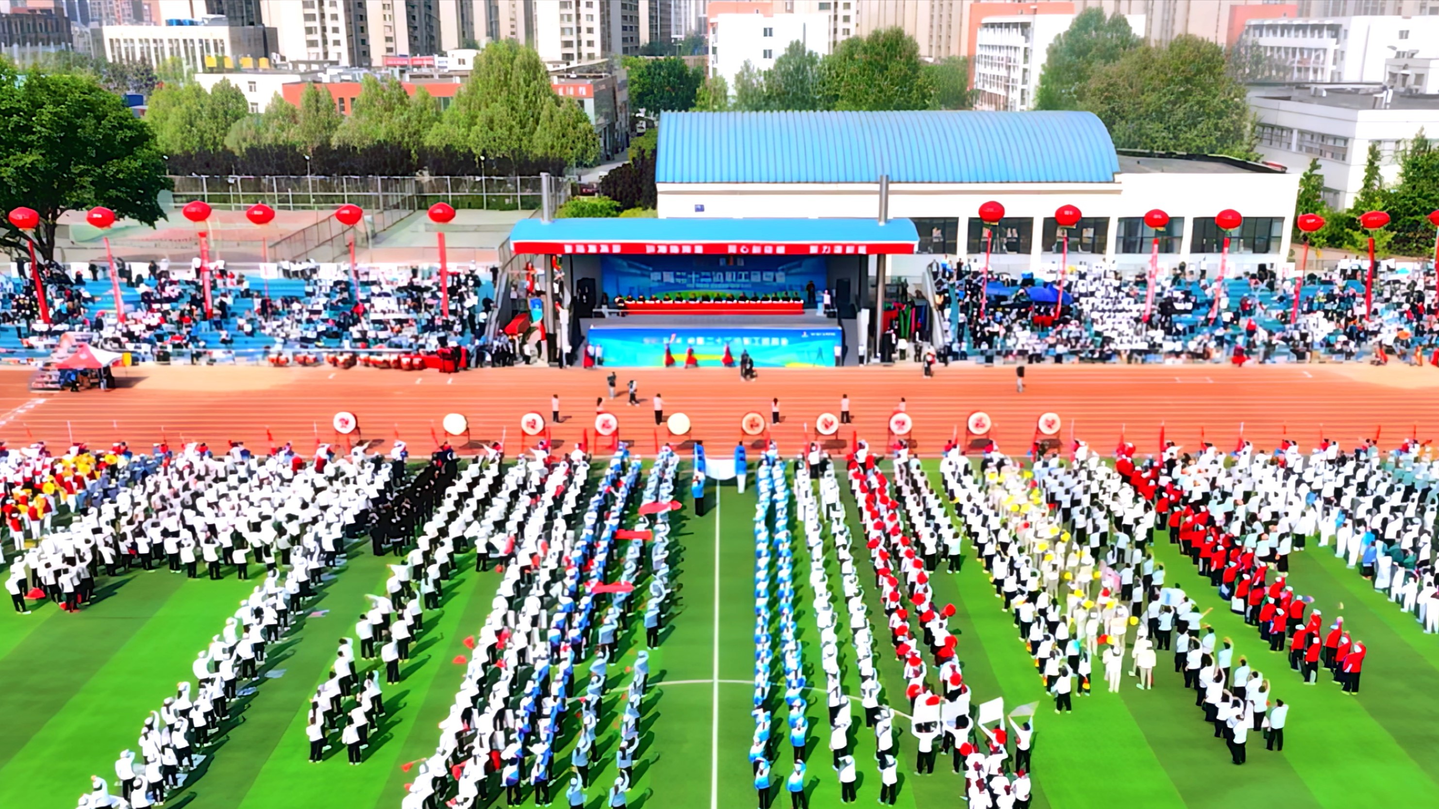 龍騰獅舞迎盛世,鼓聲激揚慶華章。體育場內彩旗飄揚、歡聲笑語,呈現(xiàn)出一派熱烈歡快的活動氣氛。上午8時,伴著雄壯激昂的《運動員進行曲》,運動會開幕式正式開始,由國旗護衛(wèi)隊、司旗護衛(wèi)隊以及各單位、裁判員組成的43支方陣,依次在主席臺前進行亮相展示。他們以飽滿的精神、整齊的隊列、嘹亮的口號,昂首闊步,接受大賽檢閱。