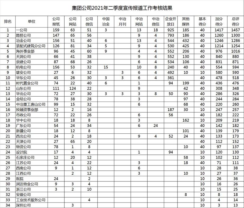 集團(tuán)公司2021年二季度宣傳報(bào)道工作考核結(jié)果